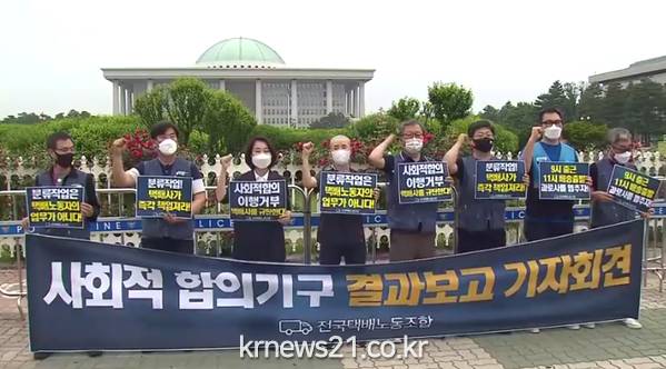 택배노조는 지난 8일 오후 서울 영등포구 여의도 국회 앞에서 기자회견을 열고 "이날 진행된 사회적 합의가 최종 결렬됐다"며 “9일부터 쟁의권이 있는 전국 모든 조합원들은 무기한 전면파업에 돌입할 것”이라고 밝혔다.