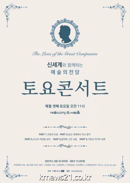 예술의전당(사장 유인택)은 <신세계와 함께하는 예술의전당 토요콘서트>(이하 토요콘서트)를 6월 19일(토) 오전 11시 콘서트홀에서 개최한다.