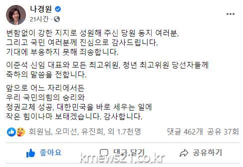 ▲ [이미지출처 = 나경원 전 의원 페이스북 캡처]국민의힘 당 대표 경선에서 낙선한 나경원 전 의원이 이준석 신임 대표에게 축하 인사와 더불어 정권 교체에 힘을 보태겠다는 심경을 전했다.