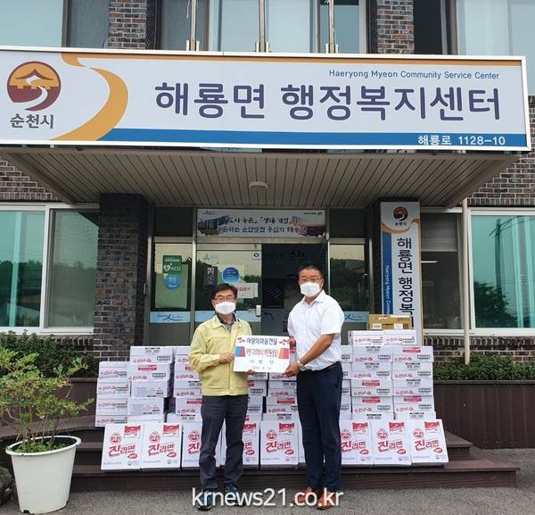 순천시 해룡면 소재 ㈜청인(대표 송용진)은 지난 10일 100만원 상당의 라면 111박스를 해룡면 행정복지센터에 전달했다.