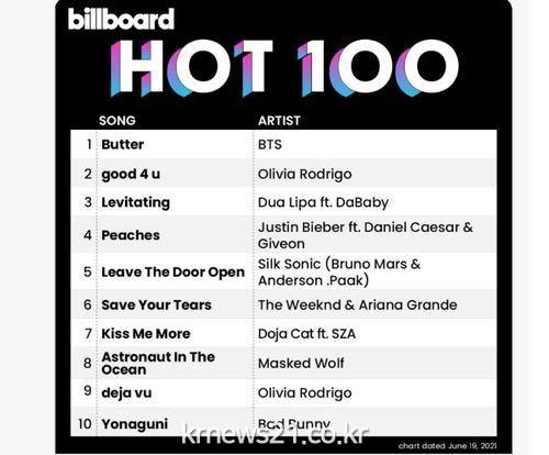 미국의 '괴물 신인' 올리비아 로드리고의 '굿 포 유'(good 4 u)는 '버터'에 밀려 3주 연속 2위에 머물렀다.