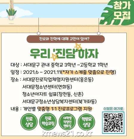 ▲ [사진=홍보포스터]서대문구는 청소년들이 주도적으로 자신의 진로를 탐색하고 미래를 설계할 수 있도록 이달부터 올 11월까지 일명 ‘진담 프로그램’을 운영한다.