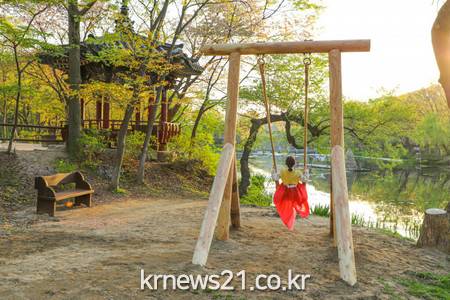 이외에도 신윤복의 ‘단오풍정’을 재현한 포토존에서 기념사진을 남길 수 있다. 민속촌을 가로지르는 아름다운 천변에는 그네터와 한복 소품이 준비됐다. 조선 시대 명화 속 주인공이 되어보는 민속촌만의 특별 포토존이다.