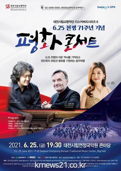 ▲ [사진=홍보포스터]대전시립교향악단은 6.25 전쟁 발발 71주년을 맞아 순국선열과 호국영령의 숭고한 희생정신을 기리고 참전용사에 감사의 마음을 전하기 위한 디스커버리시리즈 6 ‘평화 콘서트’를 오는 25일 저녁 7시 30분, 대전시립연정국악원 큰마당에서 개최한다.