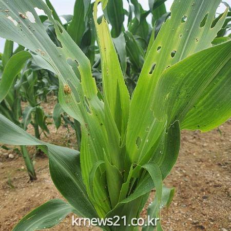 ▲ [사진제공 = 홍성군]홍성군농업기술센터는 서부면 광리와 이호리 일대에서 비래해충 예찰결과 열대거세미나방이 발견됨에 따라 벼, 옥수수 재배농가에 신속한 방제에 나서 줄 것을 당부했다.