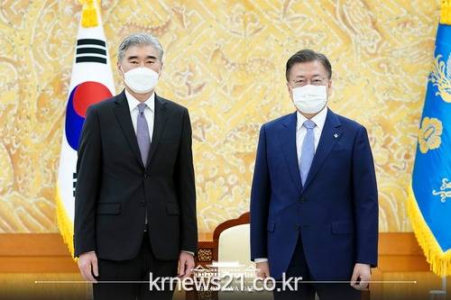 ▲ [사진출처 = 청와대 페이스북]문재인 대통령은 22일 성 김 미국 국무부 대북정책특별대표를 만나 조 바이든 미국 행정부의 대북정책에 공감을 표하고, 한국과 긴밀한 공조로 북한의 대화 재개를 위해 노력해줄 것을 당부했다.