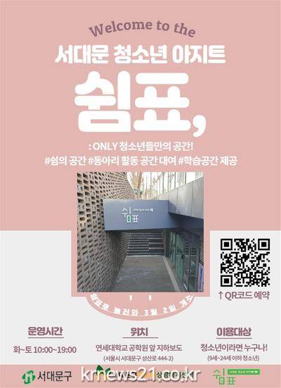 ▲ [사진=홍보포스터]서대문구가 연세대학교 정문 앞 지하보도에 올해 3월부터 청소년 아지트 ‘쉼표’(성산로 444-2)를 열어 무료로 운영해 오고 있다.
