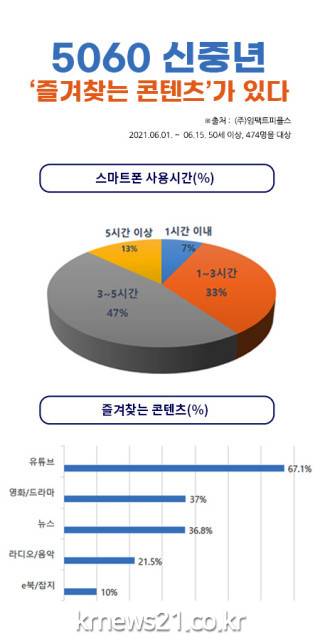 ▲ [자료제공 = 임팩트피플스]5060 신중년의 60%가 하루 3시간 이상 스마트폰을 사용하는 것으로 나타났다. 이 중 가장 즐겨 보는 콘텐츠는 유튜브(67.1%), 영화/드라마(37%), 뉴스(36.8%)인 것으로 조사됐다. 현재 콘텐츠를 구독하고 있다는 응답자는 11%에 그쳤으나 52%가 유료 구독 의향이 있으며 적정 금액은 월 5000원이라고 답했다.