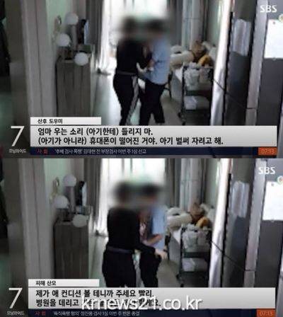 ▲ [사진출처 = SBS 캡처]정부 지원 업체에서 보낸 산후도우미가 생후 20일도 채 안 된 아기를 바닥에 거꾸로 떨어뜨리는 사건이 발생했다. ‘쿵’ 소리를 듣고 방에서 나온 산모에게는 ‘아기가 아닌 휴대전화를 떨어뜨린 것’이라고 황당한 주장을 했다. 이 사고로 아기는 뇌진탕 소견을 받았다.