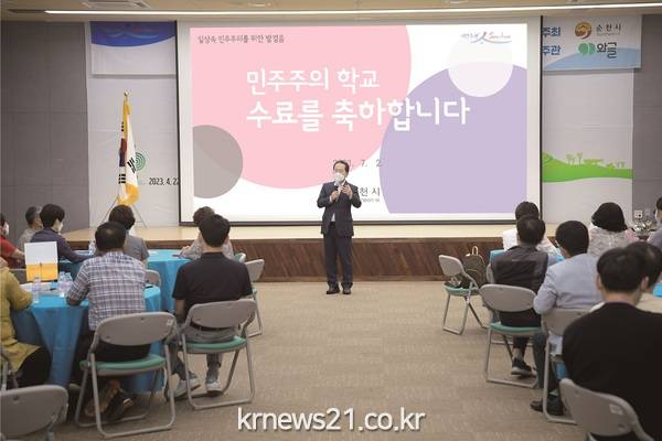 허석 시장은 민주주의학교 수료식에 참석해 수료생 한 분 한 분에게 수료증을 전달하면서 격려하였고, “나의 삶은 내가 주인이듯 시정의 주인은 모든 시민이다.”며, “시민들이 시정의 주체가 되어 생활 속 작은 문제부터 정책 결정까지 시민 한 사람 한 사람의 생각과 의견을 모아 더 나은 시민 중심 시정을 펼쳐 순천을 직접민주주의 선도도시로 꽃피우고자 한다.”고 전했다.