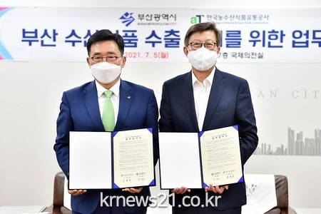 부산시는 오늘(5일) 오후 5시 30분, 시청 7층 국제의전실에서 한국농수산식품유통공사와 「부산 수산식품 수출 확대를 위한 업무협약」을 체결했다고 밝혔다.