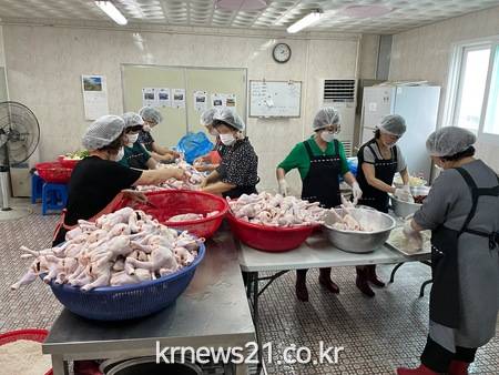 ▲ [사진제공 = 이천시]한국자유총연맹 이천시지회 창전동분회(회장 김세영), 창전동 부녀민원봉사대(회장 정선옥)은 8일 창전동행정복지센터에서 관내에 거주하는 200명의 저소득 어르신들에게‘사랑의 삼계탕 나눔’봉사활동을 펼쳤다.