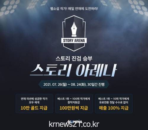 스토리 아레나는 문피아가 진행하는 연간 30억원 규모의 ‘창작지원 프로젝트 2021’의 하나다. 웹소설 작가의 매일 연재를 응원하고, 웹소설 작가를 꿈꾸는 예비 작가의 성공적인 작가 데뷔를 지원하기 위해 마련됐다.