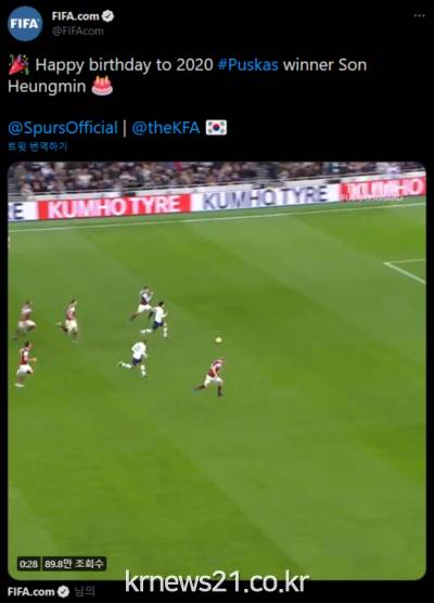 FIFA는 8일(한국시각) SNS 공식 계정을 통해 "2020년 FIFA 푸스카스상 수상자인 손흥민의 생일을 축하합니다"라는 게시물을 올렸다.
