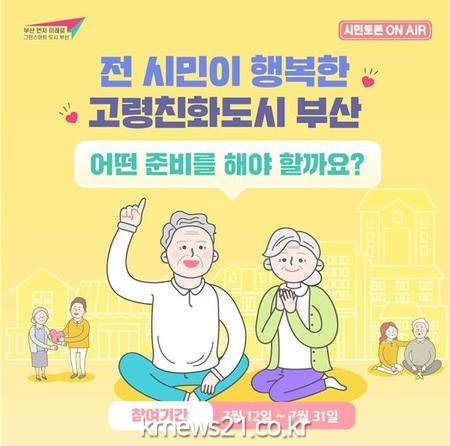 ▲ [사진=홍보포스터]부산시(시장 박형준)는 시민과 함께 만들어가는 고령친화도시를 위해 시민토론을 7월 12일부터 7월 31일까지 20일간 시 홈페이지에서 실시한다고 밝혔다.