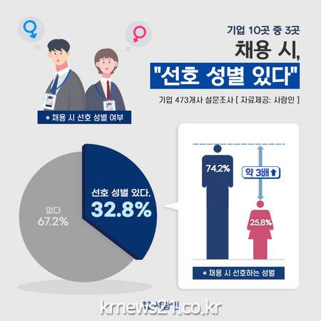 ▲ [자료제공 = 사람인]취업 시 성별에 의한 차별을 없애기 위해 블라인드 채용을 비롯해 다양한 시도를 하고 있으나, 채용 현장에서는 여전히 특정 성별을 선호하는 현상이 있는 것으로 나타났다.