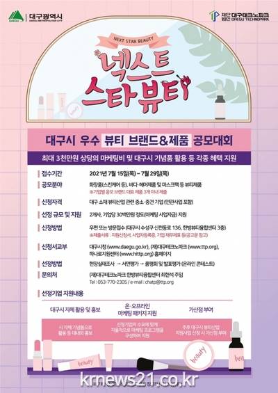 대구시가 주최하고, (재)대구테크노파크 한방뷰티융합센터 주관으로 개최하는 ‘지역 우수뷰티 브랜드 및 제품 공모대회’는 2018년부터 추진해 온 ‘스타 뷰티 브랜드 육성사업’으로서, 예년의 오프라인 선정방식에서 벗어나 올해 처음으로 온라인 콘테스트 방식으로 진행하며, 선정과정을 시민들에게 공개한다.