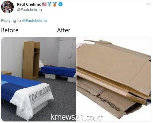 지난 17일(현지시간) 도쿄 올림픽 미국 장거리 달리기 대표 선수이자 2016년 리우데자네이루 올림픽 은메달리스트인 폴 첼리모는 자신의 트위터를 통해 도쿄 올림픽 조직위원회(조직위)가 선수촌에 제공한 골판지 침대 사진을 올렸다.