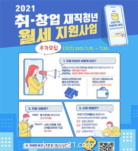 ▲ [사진=홍보포스터]인천광역시(시장 박남춘)는 청년의 경제적 자립과 고용 안정을 위해 주거비의 일부를 지원하는 ‘취ㆍ창업 재직 청년 월세 지원 사업’대상자를 7월 30일까지 신청·접수 받는다고 밝혔다.