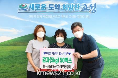 ▲ [사진제공 = 고성군]한국생활개선 고성군연합회(회장 김희자)는 7월 23일 고성군청을 방문해 관내 어려움을 겪고 있는 저소득층을 위해 감자(5kg) 50박스를 전달했다.