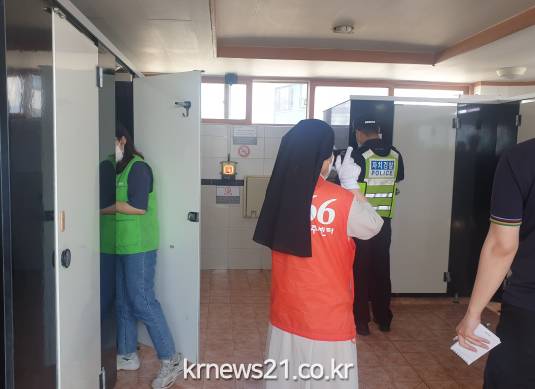 ▲ [사진제공 = 제주시]제주시는 여성긴급전화 1366 제주센터, 제주특별자치도 자치경찰단, 서부경찰서와 합동점검반을 구성하여 제주시 지정 해수욕장 8개소에 대해 6월부터 7월까지 공중화장실 불법 촬영 카메라 점검을 실시했다.