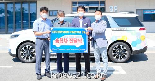 ▲ [사진제공 = 진천군]진천군장애인체육회(회장 송기섭)가 26일 장애인체육 이동차량 전달식을 가졌다.