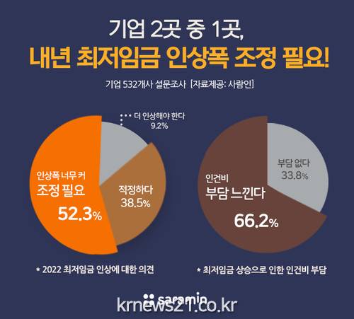 ▲ [자료제공 = 사람인]2022년 최저임금이 올해(8,720원)보다 5.1% 인상된 9,160원으로 결정됐다. 코로나19 4차 대유행으로 내년도 경영 계획에 적신호가 켜진 기업들은 이번 최저임금 상승에 대해 어떻게 생각할까.