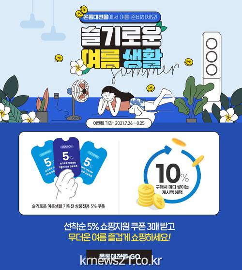 26일부터 8월 25일까지는 ‘슬기로운 여름생활’이라는 여름상품 기획전도 펼쳐진다. 기획전 상품 전용 5% 할인 쿠폰이 3장씩 제공되어 쿠폰별 최대 만원씩 할인혜택을 받게 된다.