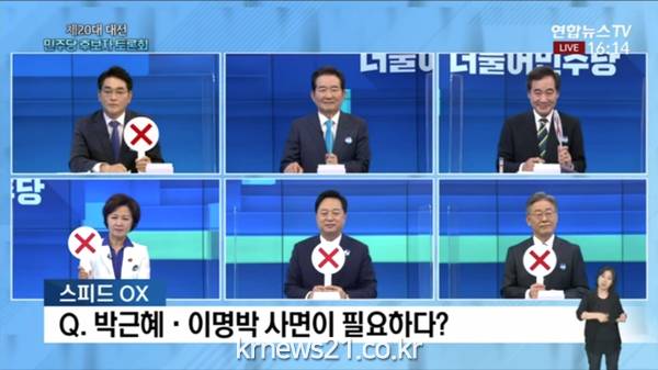 ▲ [사진출처 = 연합뉴스TV 캡처]28일 열린 더불어민주당 대선 본경선 첫 일정인 후보자 TV토론회가 날선 기싸움 속에서 진행됐다. '코로나19와 경제 현안'이라는 주제로 이뤄졌지만, 후보간 견제가 더 눈에 띄었다.