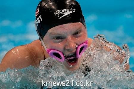 지난 31일 일본 도쿄 아쿠아틱스센터에서 열린 400m 혼성 혼계영 계주 결승에서 미국 대표팀 두번째 영자로 나선 리디아 자코비는 출발 직후 수경이 벗겨지는 상황에 놓였다.