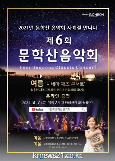 ▲ [사진=홍보포스터]인천광역시(시장 박남춘)는 『제6회 문학산 음악회』 <여름, 시네마 재즈 콘서트>를 8월 7일(토) 저녁 7시 유튜브 채널을 통해 온라인으로 생방송 개최한다고 밝혔다.