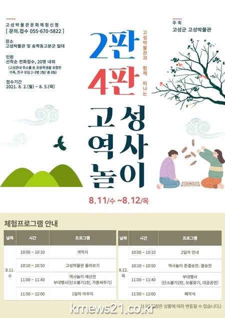 ▲ [사진=홍보포스터]고성군(군수 백두현)은 여름방학을 맞이해 8월 11일과 12일, 고성박물관 및 송학동고분군 일원에서 ‘2판4판 고성역사놀이’ 문화행사를 개최한다.