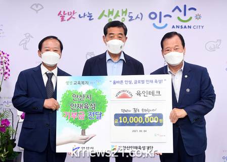 ▲ [사진제공 = 안산시](재)안산인재육성재단(이사장 윤화섭 안산시장)은 4일 ㈜육인테크(대표 조갑훈)로부터 기부금 1천만 원을 기탁 받았다.