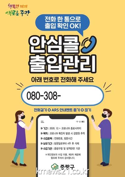 ▲ [사진=홍보포스터]중랑구(구청장 류경기)가 2일부터 올해 말까지 지역 내 출입명부 의무화 사업장 8,392곳을 대상으로 전화출입명부(안심콜) 통신료를 전액 무료로 지원한다.