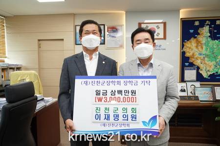 진천군의회 이재명 의원은 4일 진천군청을 찾아 지역 인재육성을 위해 써 달라며 진천군장학회(이사장 송기섭 진천군수)에 장학금 300만원을 기탁했다.