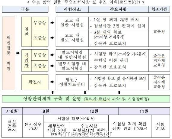 교육부는 9월 중순까지 수험생들의 백신 예방접종을 마쳐 면역 체계를 구축한다는 계획이다. 고3 학생은 1차 접종이 마무리됐고 2차 접종은 오는 20일까지 이뤄진다.