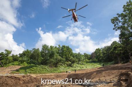 ▲ [사진제공 = 문화재청]문화재청(청장 김현모)이 산림청(청장 최병암) 협조를 받아 발굴현장에서 출토된 유물을 산림항공기편으로 이송한다.