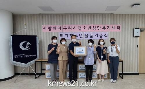 ▲ [사진제공 = 구리시]구리시(시장 안승남) 청소년상담복지센터에서는 5일 ‘사랑의 띠 자원봉사회(회장 조태성)’와 함께 관내 위기청소년을 위한 후원물품 전달식을 가졌다.