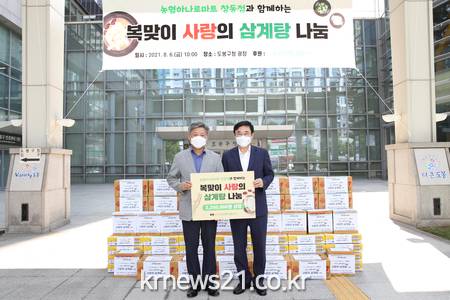 ▲ [사진제공 = 도봉구]도봉구(구청장 이동진)는 8월 6일 구청 앞 광장에서 농협 하나로마트 창동점의 후원으로 코로나19와 무더위로 지쳐있는 저소득 어르신을 위한 「복맞이 사랑의 삼계탕 나눔」 전달식을 진행했다.