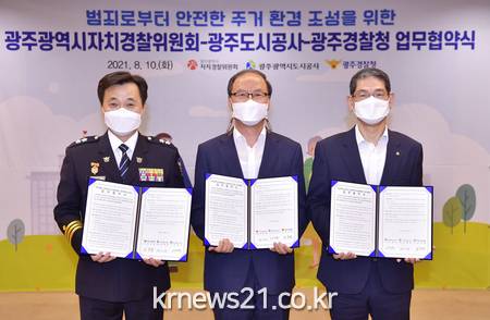광주광역시자치경찰위원회와 광주광역시도시공사는 10일 오후 시청 비즈니스룸에서 매입임대주택 방범시설물 확충 및 신축사업부지에 대한 범죄환경설계(CPTED) 컨설팅, 독거노인 등 1인가구 사물인터넷(IOT)돌봄시스템 구축을 위한 업무협약을 체결했다.
