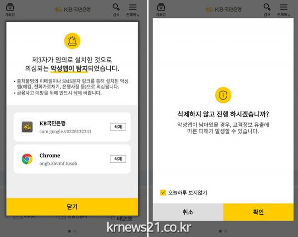 KB국민은행 담당자는 “악성앱 삭제 안내를 받고도 삭제하지 않은 고객이 20%에 이른다”며 “악성앱을 삭제하지 않고 금융서비스를 이용하면 보이스피싱 위험에 지속적으로 노출될 수 있으니 안내를 받는 즉시 악성앱을 삭제해 피해를 미연에 방지해야 한다”고 당부했다.