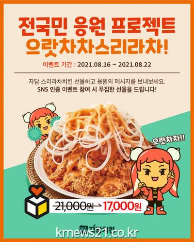 응원 메시지가 담긴 화면을 캡처해 #으랏차차스리라차 #스리라차치킨 #자담치킨을 해시태깅하고 인스타그램에 올리면 응모할 수 있다. 추첨을 통해 △애플워치(3명) △자담치킨 스리라차치킨(30명) △배스킨라빈스 싱글레귤러 교환권(300명) 등의 푸짐한 경품을 증정한다.