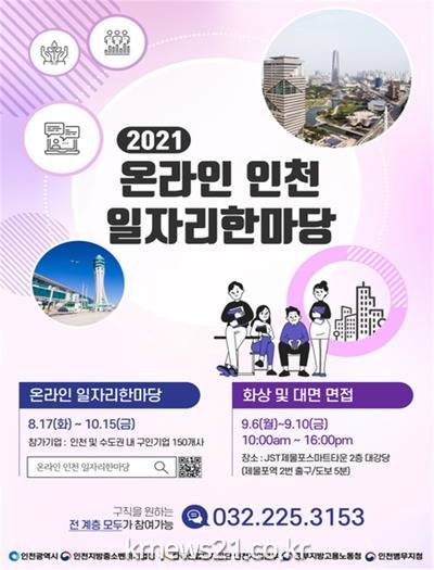 인천광역시(시장 박남춘)와 인천지방중소벤처기업청, 인천병무지청, 중부지방고용노동청, 한국산업단지공단 인천지역본부가 공동개최하는‘2021 온라인 인천 일자리한마당’(www.incheonjobfair.kr)이 8월17일부터 10월15일까지 온라인상에서 개최된다.