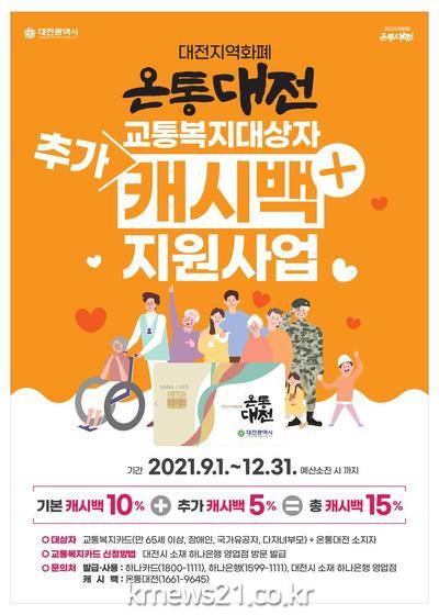 시는 9월부터 교통복지카드 발급자가 온통대전으로 결제 시, 10%의 기본 캐시백에 5%의 추가 캐시백을 더해 총 15% 캐시백을 예산소진 시까지 지급한다는 방침이다.
