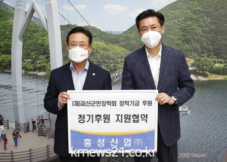 ▲ [사진제공 = 괴산군]괴산군은 홍성산업(주)(대표 김병식)이 괴산지역 인재양성에 써달라며 (재)괴산군민장학회(이사장 이차영 군수)에 장학기금 정기후원 지원협약을 했다고 20일 밝혔다.