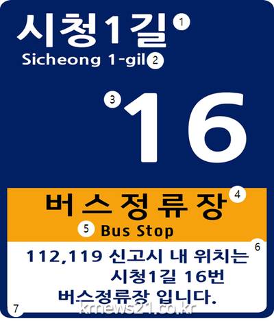 버스정류장에 설치되는 사물주소판에는 도로명, 사물번호, 사물이름 등이 표시된다.