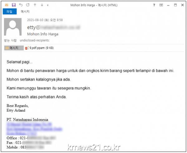 공격자는 먼저 인도네시아어로 ‘가격 정보를 부탁드립니다(Mohon Info Harga)’라는 제목으로 메일을 보냈다. 본문에도 인도네시아어로 ‘첨부된 상품 및 배송비 견적을 확인해달라(Mohon di bantu penawaran harga untuk dan ongkos kirim barang seperti terlampir di bawah ini)’며 첨부파일 실행을 유도했다. 첨부된 파일은 MS 파워포인트 프로그램에서 실행 가능한 PPAM 파일(.ppam*)이다.