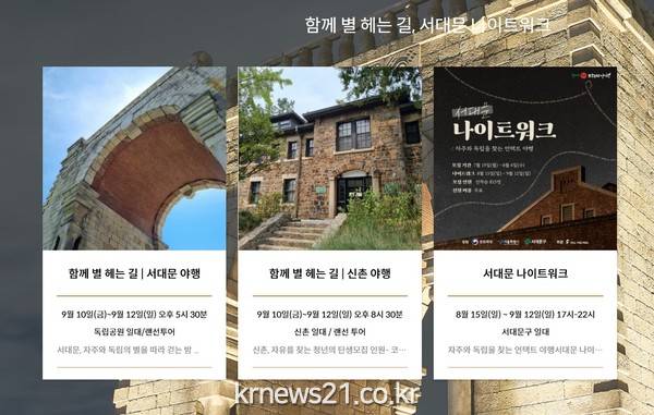 이번 해설 야행은 9월 10∼12일에 ▲서대문, 자주와 독립의 별을 따라 걷는 밤(오후 5시 30분∼7시) ▲신촌, 자유를 찾는 청년(오후 8시 30분∼10시) 등 2개 코스로 매일 진행된다.