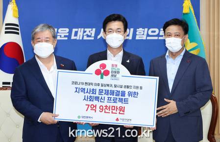 ▲ [사진제공 = 대전광역시]대전사회복지공동모금회는 2021년 추석명절 취약계층 지원금 1억 5천만 원과 코로나19 이후 일상 회복을 위한 신규사업비 지원금 7억 9700만 원 등 총 9억 4700만 원을 대전시에 전달했다.