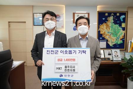 ㈜KT 김석수 충주지사장과 김형래 진천지점장은 24일 진천군청을 찾아 지역 저소득 취약계층의 주거환경개선에 사용해 달라며 성금 1천 4백만 원을 전달했다.